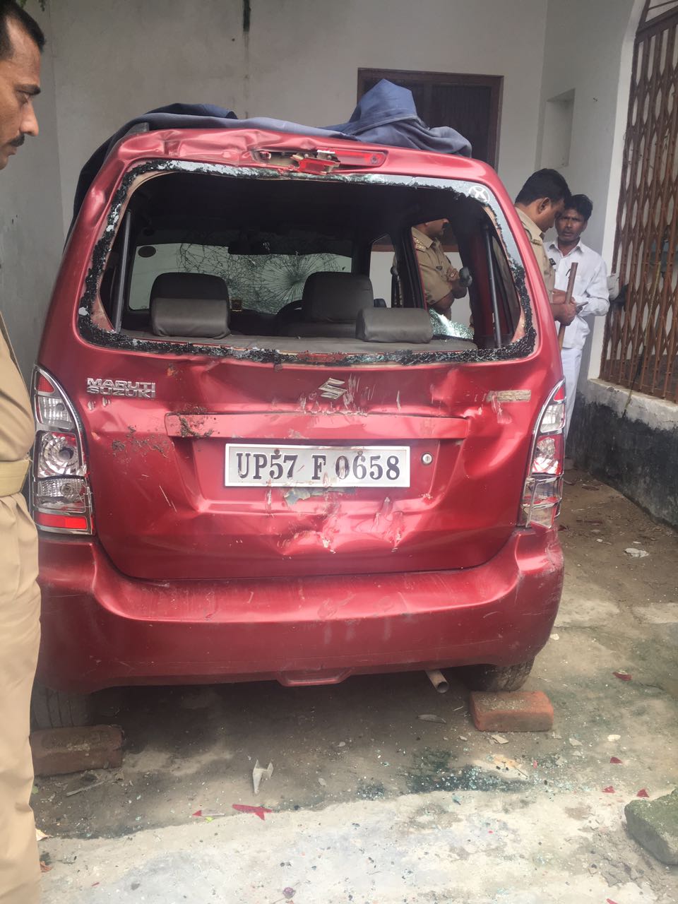 देवरिया योगीराज मे बदमाशों का आतंक सर चढ़ कर बोल रहा है आये दिन बदमाश बेखौफ होकर जनपद मे गोली फायर कर रहे है ! दो दिन के अंदर दो बार गोली चली दोपहर में 3-4 के बीच मे पहले पथंर चला देवरिया : थाना क्षेत्र कोतवाली के अंतर्गत राजेंद्र चौक पर बार एसोसिएशन तहसील सदर के पूर्व अध्यक्ष नर्बदा चौहान के आवास पर कुछ अज्ञात लोगो ने घर में घुस कर पोर्च में खड़ी मारुती वैगेन्नार पर लगभग 4 राउंड फायर किये जिससे वाहन क्षतिग्रस्त हो गया, इससे भी मन नहीं भरा तो ईट पत्थर से घर मे रखे वाहन को भी निशाना बना दिया.